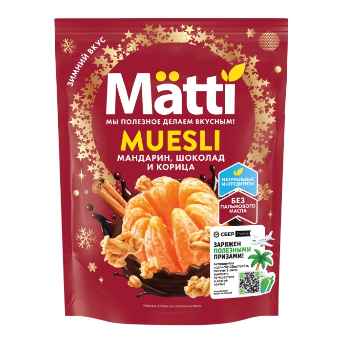 хлопья овсяные, мука пшеничная, патока, сахар, пшеница воздушная [мука пшеничная, мука рисовая, сахар, соль], масло подсолнечное высокоолеиновое, мандариновые цукаты [мандариновый сироп (концентрированный мандариновый сок, глюкозно-фруктозный сироп), морковь, мука рисовая, лимонный сок, ароматизатор натуральный], какао-порошок, корица молотая, шоколад в порошке [сахар, какао тёртое, эмульгатор: лецитин соевый], ароматизаторы натуральные, антиокислители: кислота аскорбиновая, токоферолы, концентр