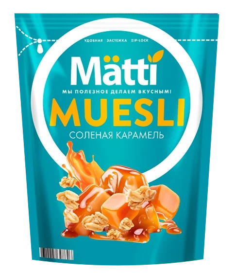 Мюсли Matti Солёная карамель - это хрустящие кранчи мюсли из цельного зерна с оригинальным вкусом карамели разнообразят ваш утренний рацион.