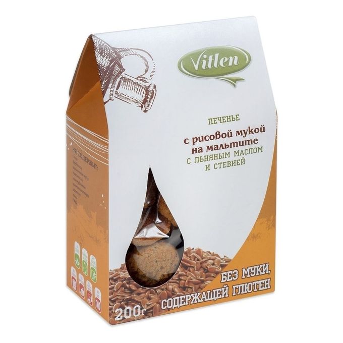 С рисовой мукой на мальтите: мука рисовая, рафинированное дезодорированное подсолнечное масло, подсластитель - мальтит, патока крахмальная, семена льна, крахмал кукурузный, мука соевая, морковь сушеная, разрыхлители: гидрокарбонат натрия, гидрпокарбонат аммония; соль, натуральный подсластитель стевия.