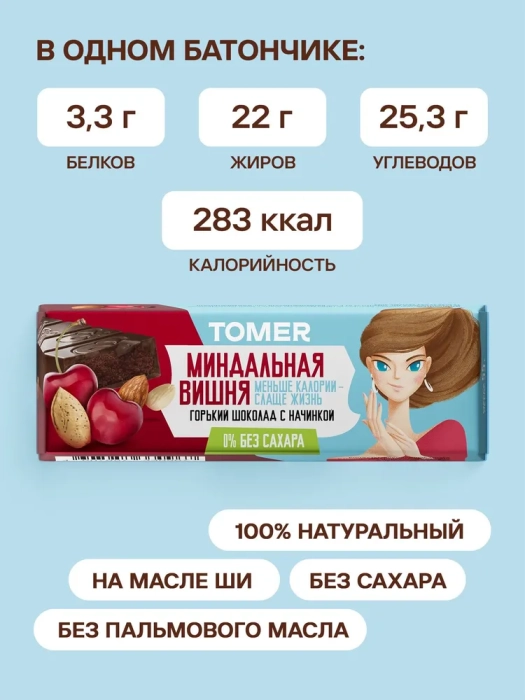 Шоколад горький 60% какао без сахара:; подсластитель мальтит; какао тёртое; какао масло; молоко сухое цельное; экстракт ванили; начинка миндальная вишня:; мальтит; масло ши; Масло какао; сыворотка молочная сухая; молоко сухое обезжиренное; молоко цельное сухое; вишня натуральная порошок; миндаль жаренный паста; эмульгатор лецитин рапсовый; экстракт ванили