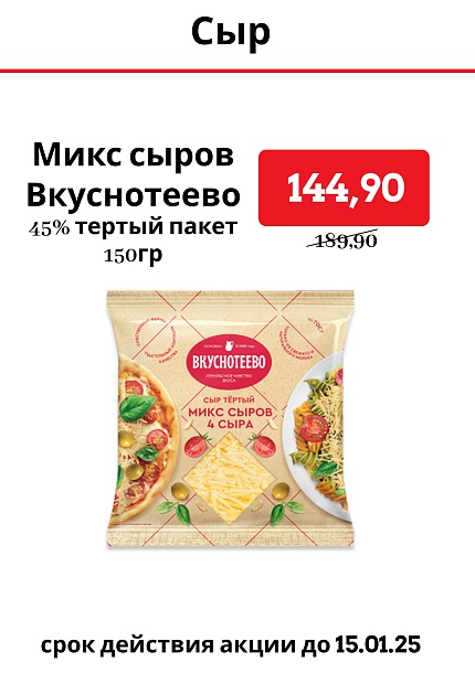 Сыр Микс сыров Вкуснотеево 45% тертый пакет 150гр
